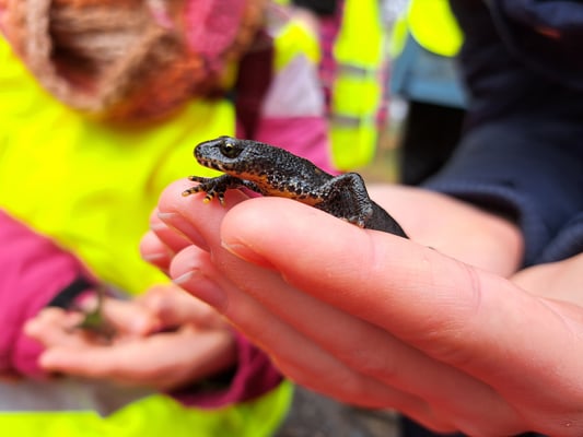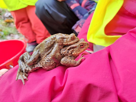 und in die Trageeimer gesetzt. Danach wurden sie zum Teich gebracht und an der Uferkante ins Wasser entlassen. Die Gruppe hat insgesamt 39 Tiere - Erdkröten und Bergmolche - zum Teich