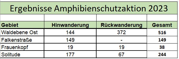 In unseren vier Amphibienschutzgebieten Solitude, Frauenkopf, Falkenstraße und dem seit diesem Jahr neu dazugekommenen Gebiet Waldebene Ost haben ca. 50 Helfer*innen von Mitte Februar bis Mitte Mai täglich Straßenkontrollen durchgeführt. Morgens, noch vor 9 Uhr, wird dabei in jeden Eimer entlang der Zäune sorgfältig nachgeschaut und im Falle eines Fundes das Tier über die Straße getragen und wieder ausgesetzt. Dabei haben unsere Helfer*innen nicht nur Erdkröten, sondern auch Grasfrösche, Bergmolche und Feuersalamander angetroffen.