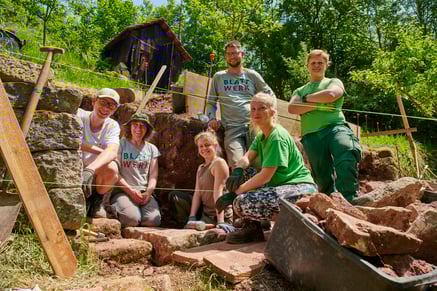 Aufgrund ihrer aufwendigen Bauweise werden historische Trockenmauern immer seltener instandgesetzt. Nur wenige kennen sich noch mit dieser alten Handwerkskunst aus. Umso spannender war es für die zehn Azubis zu sehen, was noch so alles hinter den sichtbaren Mauersteinen steckt. Der ökologisch wertvolle Bereich befindet sich hinter der Kulisse: eine sogenannte Hintermauerung, die die Stabilität der Mauer mit hochkant „verzwickelten“, also verklemmten, Gesteinsschroppen herstellt.