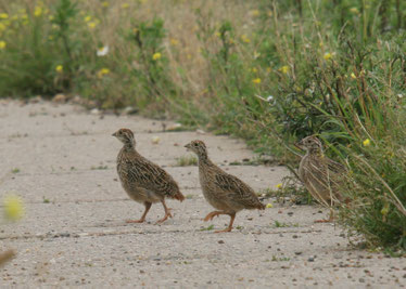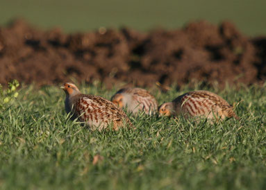 Rebhuhn-Henne und - Hahn geben sich sehr viel Mühe, mit einem Gelege von 10 bis 20 Eiern ihren Bestand zu sichern. Sie gehören zu den Hühnervögeln. Auf dem Rücken sind sie vorwiegend braungrau marmoriert, ihre Brust ist jedoch grau und das Gesicht orangebraun gefärbt. Sie sind 28 bis 32 cm groß und das ganze Jahr zu beobachten.